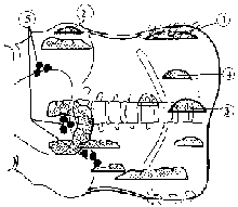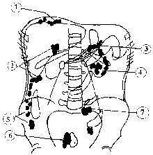 1. Между печенью и грудной стенкой; 2. Под крылом подвздошной кости; 3. В сальниковой сумке; 4. Между петлями кишки; 5. Параллельно брюшной стенке. |