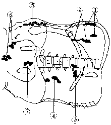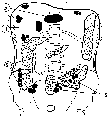 1. Поддиафрагмальный абсцесс; 2. Подпеченочный абсцесс; 3. Абсцесс в области поджелудочной железы; 4. Околопочечный абсцесс; 5. Абсцесс, расположенный в области слепой кишки; 6. Абсцесс Дугласова пространства; 7. Абсцесс между петлями кишки. |