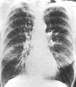 Картина ХОБ на обзорных рентгенограммах легких не слишком выразительна в начальной стадии болезни, но достаточно богата симптомами в последующем. Сужение просвета мелких бронхов — а именно это является "фамильной" чертой ХОБ — ведет к увеличению объема легких. Разумеется, наибольшей степени увеличение объема легких достигает при поражении дистальных генераций мелких бронхов и особенно бронхиол, когда возникает центрилобулярная эмфизема и вздуваются вторичные дольки — самые маленькие части легкого, еще окруженные соединительнотканной перегородкой.