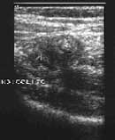 Рис. 8. Продольное сканирование перфорированного аппендикса. Контур стенки в нижней части прерывист, рядом - анэхогенное скопление жидкости. |