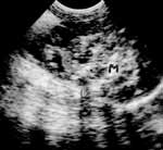 Рисунок. Нейробластома. В проекции правого надпочечника визуализируется тканевое образование с неровными нечеткими контурами, неоднородной эхоструктуры, сливающееся с верхним полюсом правой почки. |