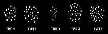 Тип1. Круглые и дуговидные кальцинаты, иногда горизонтальные или полулунные, соответствуют маленьким микрокистозным эктазиям. Тип 2. Круглые, правильной формы. Тип 3. Пылевидные, очень нежные. Тип 4. Точечные, неправильной формы. Тип 5. Червеобразные, древовидные. Отражают внутрипротоковый некроз. |