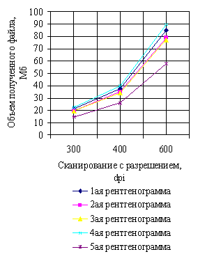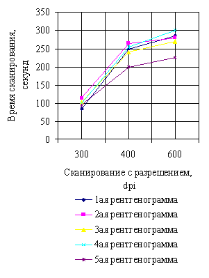 Как видно, при повышении разрешения, с которым осуществлялось сканирование рентгенограмм, с 300 до 400 dpi время сканирования увеличивалось более чем в 2 раза и лишь незначительно при дальнейшем повышении разрешения до 600 dpi. Объем полученного файла увеличился менее чем в 2 раза при повышении разрешения с 300 до 400 dpi и резко возрастал при переходе к 600 dpi. При этом минимальное время сканирования составило 85 секунд, максимальное 285 секунд, минимальный объем файла 14,5 Мб, максимальный 89,7 Мб. Наибольшая разбежка времени сканирования рентгенограммы при переходе от разрешения 300 к 600 dpi составила 3,35 раза (с 85 до 285 секунд), а разбежка объема файлов 4,1 раза (19,7 и 78,9 Мб). Учитывая, что сканировалась лишь одна (правая) половина рентгенограмм, то при сканировании целого снимка с разрешением 600 dpi время сканирования будет не менее чем в 7, а объем файла в 8 раз больше, чем при сканировании той же рентгенограммы с разрешением 300 dpi. На сканирование рентгенограммы понадобится примерно 9 (!) минут. К этому необходимо добавить значительно возрастающую нагрузку на все системы компьютера при большем объеме файлов (около 160 Мб на одну рентгенограмму органов грудной клетки при разрешении 600 dpi!).