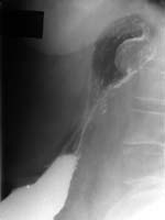 Рис. 1. Прямая прекция. На фоне газового пузыря в кардиальном отделе желудка на задней стенке имеется дополнительная тень округлой формы с четкими ровными контурами, размерами 3х4см. |