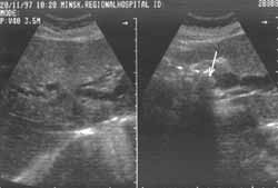 Рис. 2. Холедохолитиаз. Конкремент в просвете холедоха (стрелка). Расширены внутрипеченочные желчные протоки (кадр слева). |