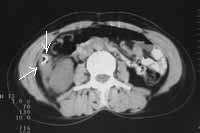 Рис. 4. Рак восходящей кишки: неравномерное утолщение стенок (стрелки) с инфильтрацией переднего листка околопочечной фасции и околопочечной клетчатки. |