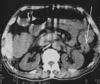 Рис. 5. Рак верхней трети нисходящей кишки (стрелка): неравномерное утолщение стенок кишки, их регидность, инфильтрация окружающей клетчатки в виде тяжей с вовлечением переднего листка околопочечной фасции, наличие признаков кишечной непроходимости. |