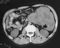 опухоль исходила из правой почки и вовлекала восходящую кишку. В другом