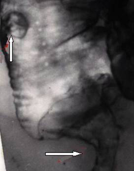 Рис. 3. Циркулярный рак прямой кишки (горизонтальная стрелка). «Пограничный» полип дистального отдела сигмовидной кишки (вертикальная стрелка).