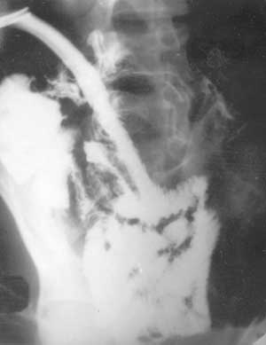 Рис. 4. Дистальная постстомальная энтерография при петлевой еюностоме. Контрастированы подвздошная кишка, илеоцекальный переход и слепая кишка.