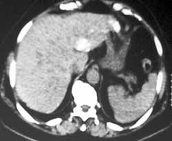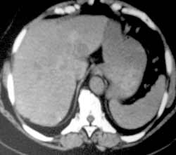 Рис. 1. Рак печени. (Слева) При КТ органов брюшной полости