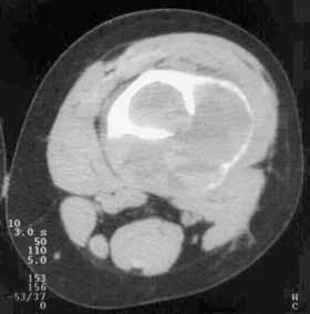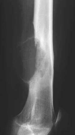 Рис. 3. Аневризматическая костная киста бедренной кости. (Слева)