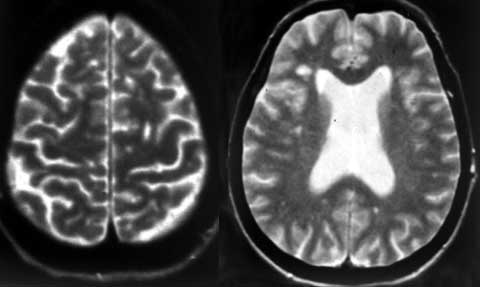 Рис. 1. Очаги демиелинизации в полушариях (слева) и стволе (справа) головного мозга с повышением и снижением интенсивности сигнала при ремиттирующий РС.