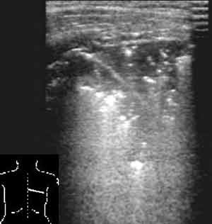 Рис. 2. Пневмонический очаг, содержащий эхогенные полоски воздуха в бронхах и тонкую межсегментарную перегородку.