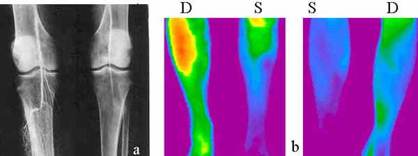 Рис. 5. Облитерирующий тромбангит. (а) Артериография. Полная непроходимость обеих артерий правой и левой голени. Хорошо развитая коллатеральная сеть сосудов от правой передней берцовой артерии. (б) Термография. Слабая гипотермия по передней поверхности правой голени. "Термоампутация" левой стопы в обеих проекциях. ТБИ равен нулю.