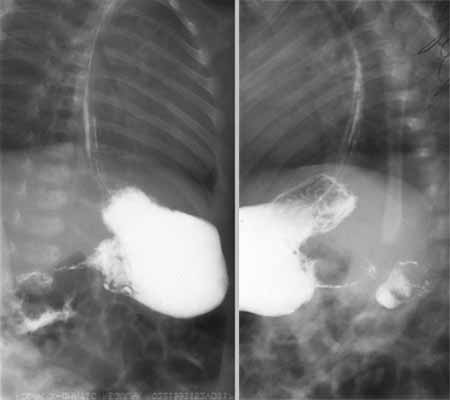 Рис. 2. Больной В., 1 мес. Врожденный пилоростеноз. Симптом «усика» или «жгутика». Вторичный гастроэзофагальный рефлюкс.