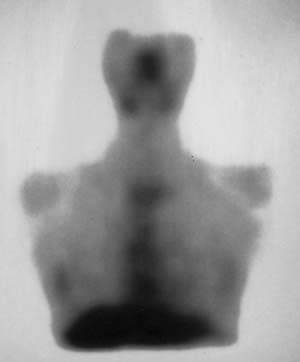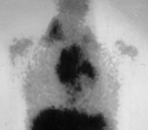 Рис. 2. Сцинтиграфия с цитратом галия-67 при лимфогрануломатозе. (Слева)
