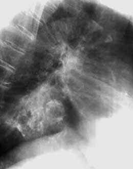 угле. (Справа) На правой боковой ренгенограмме грудной клетки добавочная