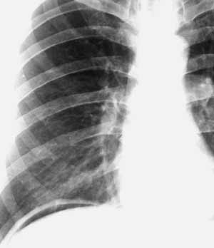 Рис. 5. Пневмоперитонеум - полоска просветления под правым куполом диафрагмы - следствие прободения язва двенадцатиперстной кишки.