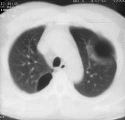 Рис. 3. В правом реберно-позвоночном углу булла, не выявленная на обычной рентгенограмме.