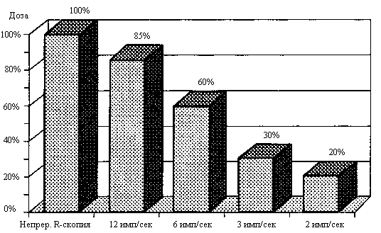 Диаграмма. Результаты контрольных измерений дозы облучения при использовании трубки с импульсным излучением. Уровень дозы 20% при частоте импульсов 2 в секунду означает что получаемая пациентом доза облучения составляет пятую часть от обычной, неимпульсной рентгеноскопии: снижение лучевой нагрузки составляет 80%.
