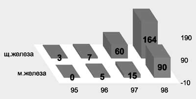 Рисунок 1. Рост диагностических пункций под контролем УЗ-луча образований молочной и щитовидной железы за 1995-1998 гг.