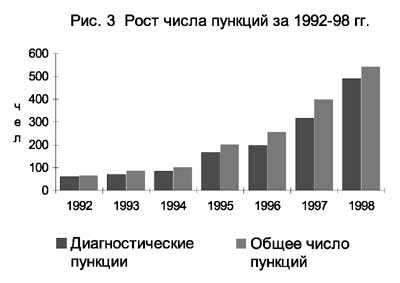 Рис. 3. Рост диагностических пункций под контролем УЗ-луча образований молочной и щитовидной железы за 1995-1998 гг.