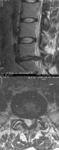 Рис. 2. Боковая грыжа межпозвонкового диска L5-S1 (1), заполняющая левый боковой карман и сужающая межпозвонковое отверстие слева. Сагитальное и аксиальное изображения.