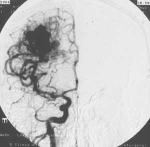 Рис. 1 и 2. Артерио-венозная мальформация в правой теменной области,