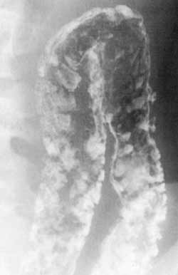 Рис. 5. Язвы-запонки - небольшие изъязвления на кишечной стенке, наполненные контрастным веществом.
