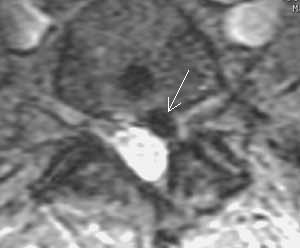 латеральном кармане. (Слева) Имеет пониженную интенсивность при GRE