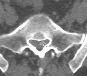 Рис 2. Обызвествленная пролабированная часть диска L5-S1 в правом
