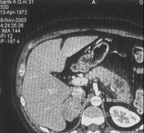 Рис. 6. На Рис. 6 и 7 демонстрируется роль поворота пленки при сканировании. На данном изображении выраженная полосатость, особенно хорошо заметная на фоне печени. Этот артефакт объясняется построчной распечаткой изображения на пленку принтером (в данном случае на термопринтере AGFA DryStar3000).