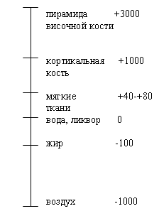 После сканирования объекта и компьютерной обработки сигнала реконструируется графическое изображение среза (графическая матрица). При этом каждой ячейке матрицы соответствует расчитываемый компьютером коэффициент абсорбции (КА) тканей, он же коэффициент ослабления, выражаемый в единицах Хаунсфилда (ед. Н, или Hounsfield Units, или HU). КА по смыслу аналогичен степени почернения рентгенограммы, т.е. он показывает на сколько ткань способна поглощать (ослаблять) рентгеновские лучи. Кость поглощает рентгеновские лучи сильнее других тканей и имеет наибольший КА (+800+3000 ед. Н). Воздух практически не поглощает и имеет наименьший КА (-1000 ед. Н). КА воды принят за 0. При этом, чем больше КА ткани, тем сильнее она поглощает излучение, тем меньше фотонов излучения доходит до детектора томографа и тем более белой она выглядит на КТ: кость самая белая, воздух самый черный. Т.о. различение нормальных и патологических образований на КТ производится по градациям перехода от черного к белому цвету (градациям серого цвета). КА является основной характеристикой КТ-изображения по плотности и в современных КТ колеблется от -1000 до +3000 ед. Н. Некоторые ткани и соответствующие им параметры плотности, выраженные в единицах Хаунсфилда, представлены на Рисунке.