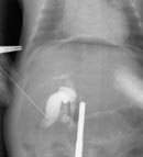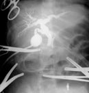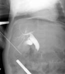 Рис. 5. Чрезкожная чрезпеченочная холецистохолангиография под контролем лапароскопа (контрастное вещество в 12-перстной кишке). |