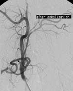 Консилиумом из двух специалистов по ангиографии устанавливался диагноз и оценивались источники кровоснабжения опухоли. Во всех случаях опухоль получала артериальное кровоснабжение из ветвей наружной сонной артерии. Характер кровоснабжения был множественный, но в 100% случаев основным питающим сосудом являлась восходящая глоточная артерия. Далее катетер продвигался в наружную сонную артерию и выполнялась селективная артериография последней. На снимках более детально визуализировалась опухоль, питающий сосуд, возможные коллатерали. Далее катетер продвигался в питающий опухоль сосуд, которым всегда, как правило, являлась упомянутая выше восходящая глоточная артерия (Рис. 2).