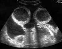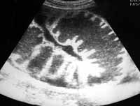 Функциональная непроходимость кишечника во время УЗИ характеризовалась значительным полиморфизмом. Отмечалось повышение пневматизации и вздутие петель кишечника, значительное уменьшение вплоть до полного исчезновения перистальтики кишечника, расширение и накопление небольшого количества жидкости преимущественно в тонкой кишке, поперечной ободочной и в правых отделах толстой кишки в зависимости от причины, вызвавшей парез кишечника. Так, например, при остром панкреатите определялось ограниченное скопление эхонегативной жидкости в поперечной ободочной кишке (7), при остром аппендиците — в области купола слепой кишки (11). В отличие от механической непроходимости, антиперистальтических движений, переливания жидкости из одной петли кишки в другую не наблюдалось. Отмечалось лишь маятникообразные движения кишки в пределах ограниченного сегмента, содержащего жидкость.