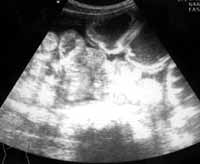 Из перечисленных критериев при первичном УЗИ у этих больных чаще наблюдалось неоднородное жидкое содержимое за счет внутриполостного депонирования жидкости (45), нарушения перистальтики в виде ее усиления и, особенно, активной антиперистальтики и сегментарного расширения кишечника (49). По мере ухудшения состояния характер жидкого содержимого становился более однородным, приобретал кашицеобразный характер, а затем, по мере прогрессирования кишечной непроходимости, наблюдалось снижение эхогенности содержимого вплоть до анэхогенности. Этот период обычно сочетался со снижением интенсивности сократительных движений кишечной стенки за счет антиперистальтической паузы (12).
