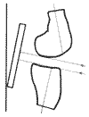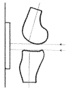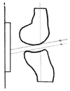 Рис. 3. Отклонение луча может быть следствием неперпендикулярности плоскости суставной поверхности большеберцовой кости к плоскости кассеты (флексия голени). |