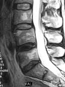 Рис. 2. Дегенеративные изменения тел позвонков - замещение красного костного мозга жировым, что проявляется усилением сигнала на Т2W изображениях. Эта стадия предшествует рентгенологическим проявлениям остеохондроза. |