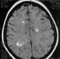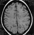 Рис. 1. Т2-взвешенное изображение. С двух сторон паравентрикулярно и субкортикально множественные разновеликие гиперинтенсивные очаги. |
