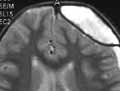 • выявляется двояковыпуклый (иногда полулунной формы) гомогенный очаг дающий в Т-2 режиме выражение гиперинтенсивный сигнал, а в Т-1 режиме умеренно или выражение гипоинтенсивный сигнал (в зависимости от содержимого); • косвенные признаки те же, что и в предыдущих стадиях и при РКТ. |