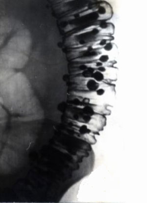 Рис. 3. Стадия полных дивертикулов. Множественные дивертикулы нисходящей кишки.