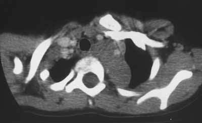 Рис. 2. Ганглионеврома верхнего средостения у больной С., 10 лет. КТА артерий дуги аорты. Левая подключичная артерия расположена в толще опухоли, левая общая сонная артерия оттеснена кпереди.