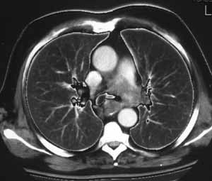 Рис. 3. КТА легочных артерий. Центральный рак легкого. Дефект контрастирования ствола и левой легочной артерии вследствие инвазии опухолью.