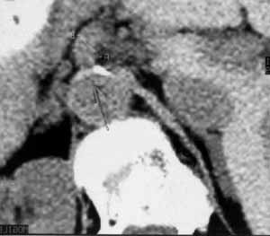 Рис. 7. КТ-томограмма. Кальцинированная бляшка в устье чревного ствола. Атеросклероз брюшной аорты.