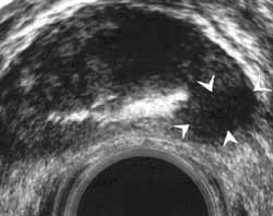 Рис. 15. Трансректальная эхограмма. Рак предстательной железы. Гипоэхогенный узел.
