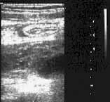 над подвздошными сосудами. Поперечное положение датчика. (Справа) Воспаленный