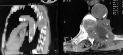 Рис. 10. Кортико-плевральный рак. Справа - компьютерная томограмма, слева - реконструкция в сагитальной плоскости. Опухоль стелется вдоль позвоночника. Разрушены 2 позвонка, поперечные отростки и задние отрезки ребер.