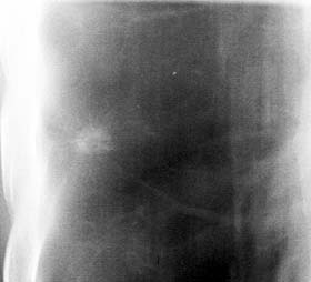 Рис. 3. Плоскоклеточный рак. Дополнительная тень неоднородной структуры с неровными, нечеткими мелкозазубренными контурами. Цифровая томограмма.